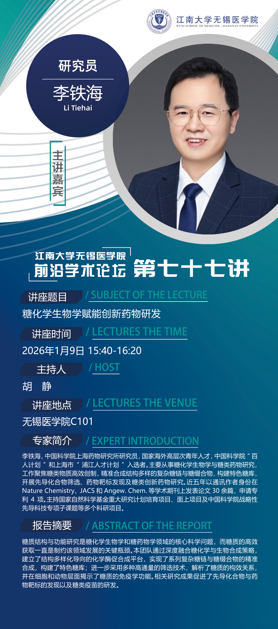 嘉宾简介:李铁海,中国科学院上海药物研究所研究员,国家海外高层次青年人才,中国科学院"百人计划"和上海市"浦江人才计划"入选者。主要从事糖化学生物学与糖类药物研究,工作聚焦糖类物质高效创制,精准合成结构多样的复杂糖链与糖缀合物,构建特色糖库,开展先导化合物筛选、药物靶标发现及糖类创新药物研究。近五年以通讯作者身份在NatureChemistry、JACs和Angew.Chem.等学术期刊上发表论文30余篇,申请专利4项。主持国家自然科学基金重大研究计划培育项目、面上项目及中国科学院战略性先导科技专项子课题等多个科研项目。