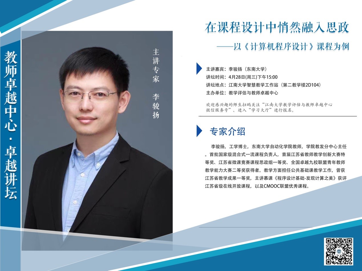 报名方式:扫描下方二维码,关注“江南大学教学评估与教师卓越中心”微信服务号,进入“学习大厅”进行活动报名。
