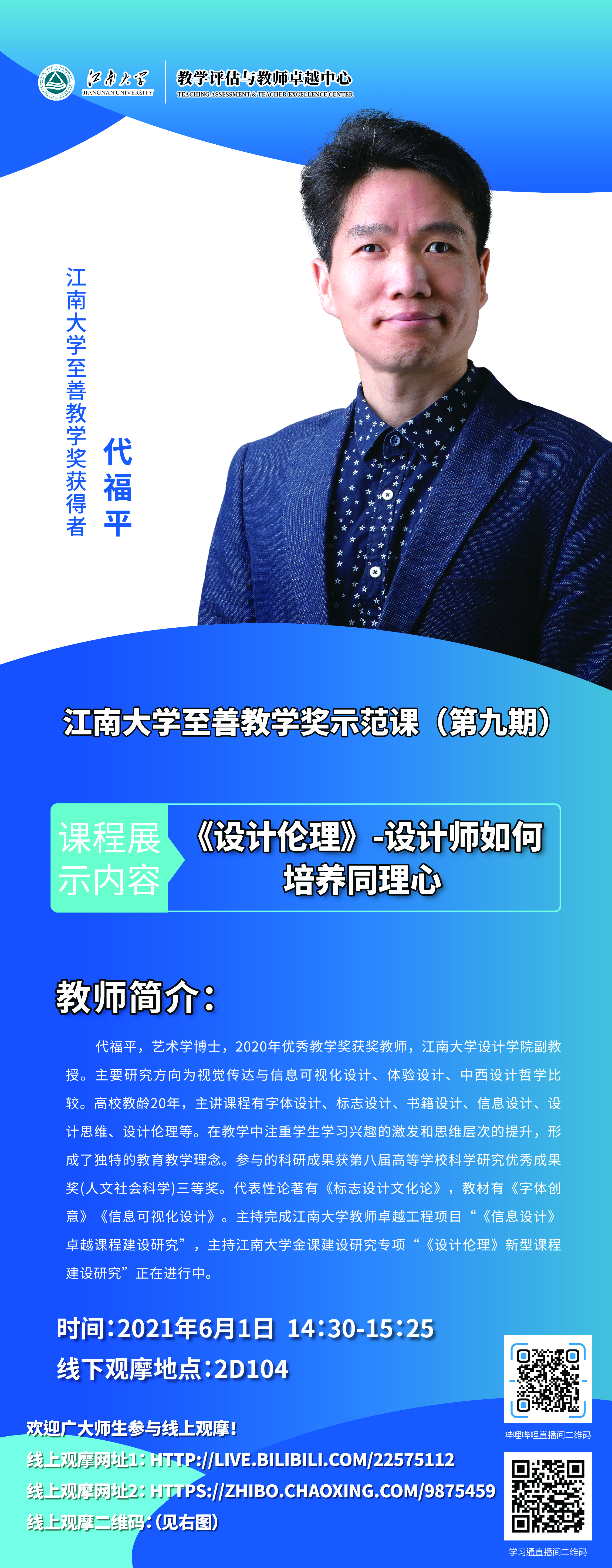 报名方式:请老师们扫描下方二维码,关注“江南大学教学评估与教师卓越中心”微信公众号,进入“学习大厅”进行活动报名。线下报名未成功教师可选择线上观摩学习,线上观摩网址:http://live.bilibili.com/22575112,或https://zhibo.chaoxing.com/9875459。