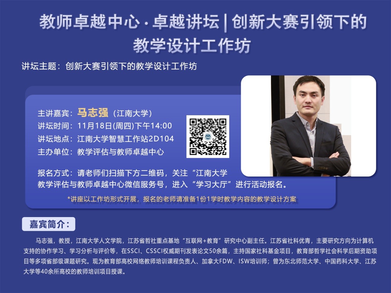 报名方式:请老师们扫描下方二维码,关注“江南大学教学评估与教师卓越中心”微信服务号,进入“学习大厅”进行活动报名。报名的老师请准备1份1学时教学内容的教学设计方案。