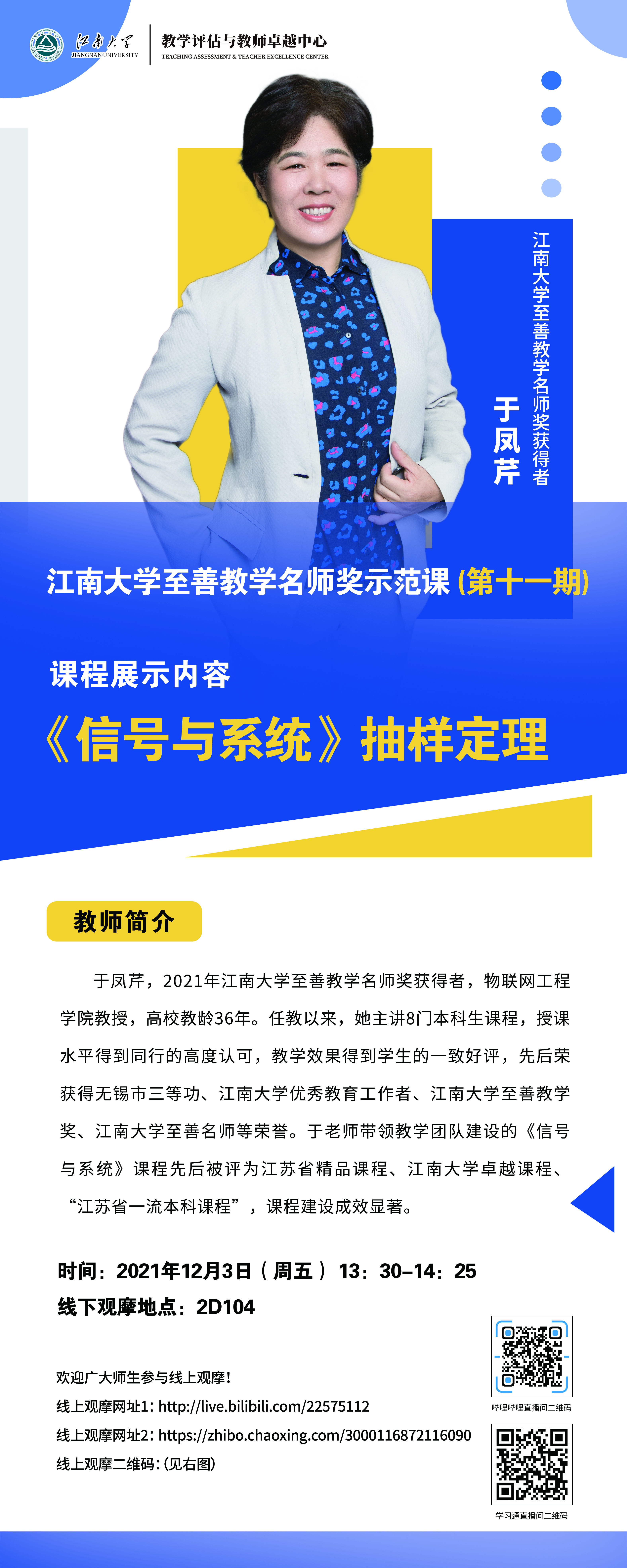 报名方式:请老师们扫描下方二维码,关注“江南大学教学评估与教师卓越中心”微信公众号,进入“学习大厅”进行活动报名。线下报名未成功教师可选择线上观摩学习。