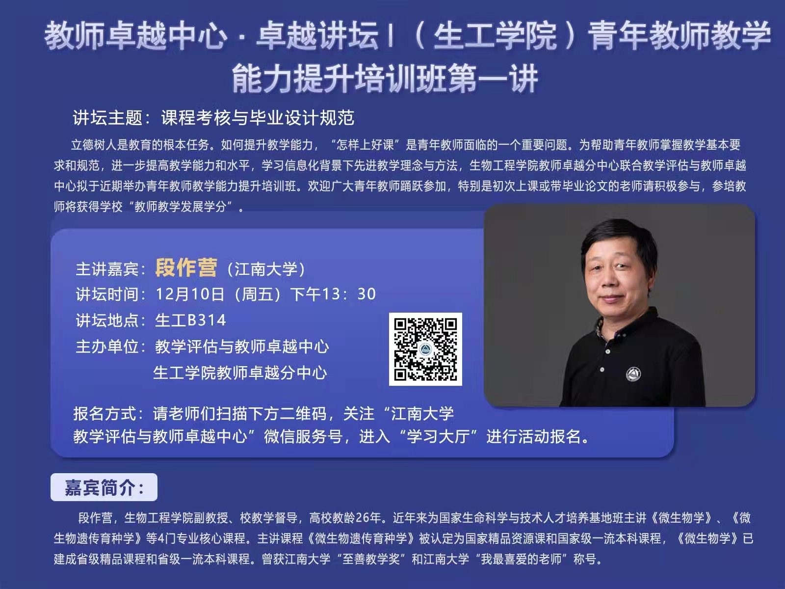立德树人是教育的根本任务。如何提升教学能力,“怎样上好课”是青年教师面临的一个重要问题。为帮助青年教师掌握教学基本要求和规范,进一步提高教学能力和水平,学习信息化背景下先进教学理念与方法,生物工程学院教师卓越分中心联合教学评估与教师卓越中心拟于近期举办青年教师教学能力提升培训班。欢迎广大青年教师踊跃参加,特别是初次上课或带毕业论文的老师,参培教师将获得学校“教师教学发展学分”。