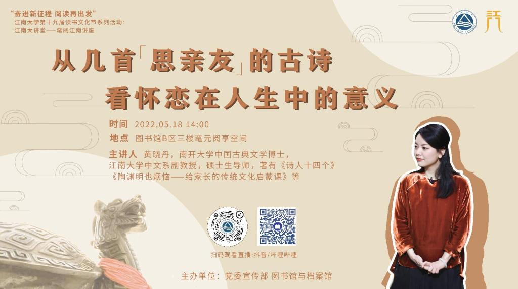 陶渊明说:“《停云》,思亲友也”。在古代,因为通讯的不便利和交通的不发达,离别和思念就成了人们最常经历,也最多被吟咏的体验。“行行重行行,与君生别离”的前路难知,“欲寄彩笺兼尺素,山长水阔知何处”的书信难达,“人生不相见,动如参与商”的重见无期,在表达离别之痛的同时,也将人生不得已的处境升华为丰富的审美。本次讲座将详细讲解数首“思亲友”的古诗,希望文学的力量能慰藉大家在疫情中的暌隔之感和思恋之情。