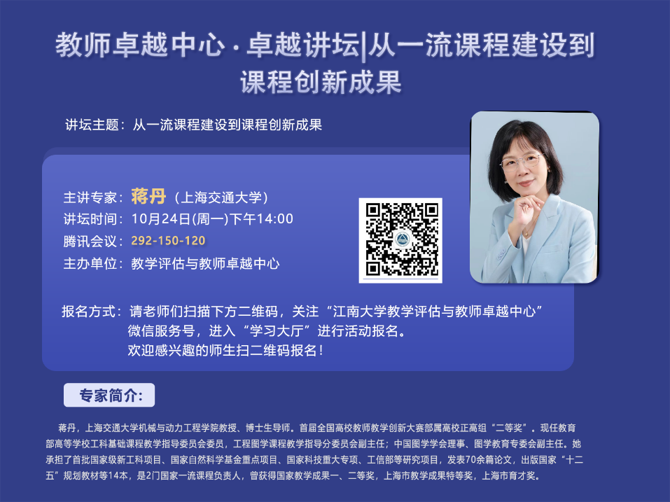 蒋丹,上海交通大学机械与动力工程学院教授、博士生导师。首届全国高校教师教学创新大赛部属高校正高组“二等奖”。现任教育部高等学校工科基础课程教学指导委员会委员,工程图学课程教学指导分委员会副主任;中国图学学会理事、图学教育专委会副主任。她承担了首批国家级新工科项目、国家自然科学基金重点项目、国家科技重大专项、工信部等研究项目,发表70余篇论文,出版国家“十二五”规划教材等14本,是2门国家一流课程负责人,曾获得国家教学成果一、二等奖,上海市教学成果特等奖,上海市育才奖。