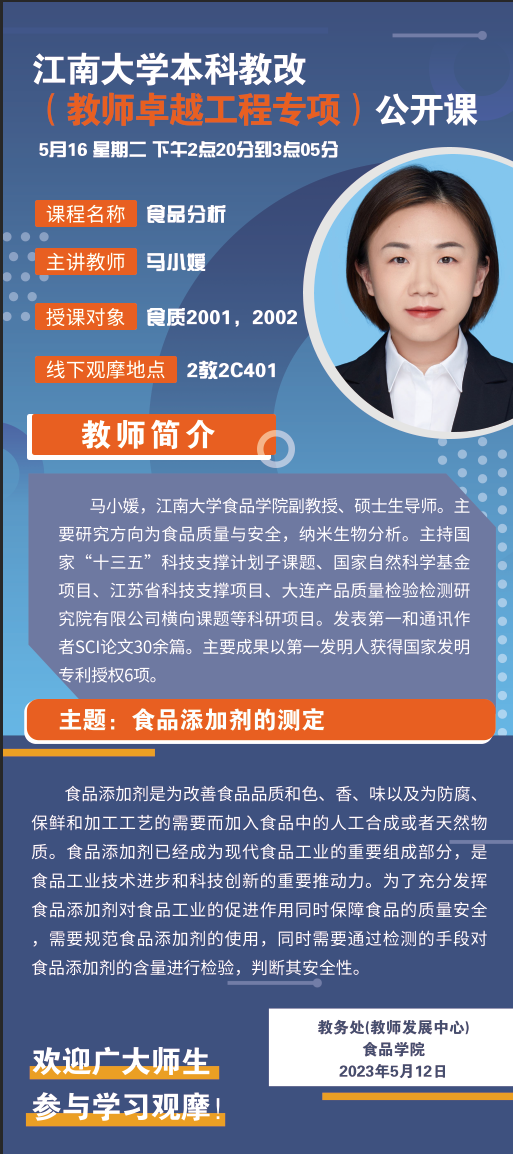 马小媛,江南大学食品学院副教授、硕士生导师。主要研究方向为食品质量与安全,纳米生物分析。主持国家“十三五”科技支撑计划子课题、国家自然科学基金项目、江苏省科技支撑项目、大连产品质量检验检测研究院有限公司横向课题等科研项目。发表第一和通讯作者SCI论文30余篇。主要成果以第一发明人获得国家发明专利授权6项。