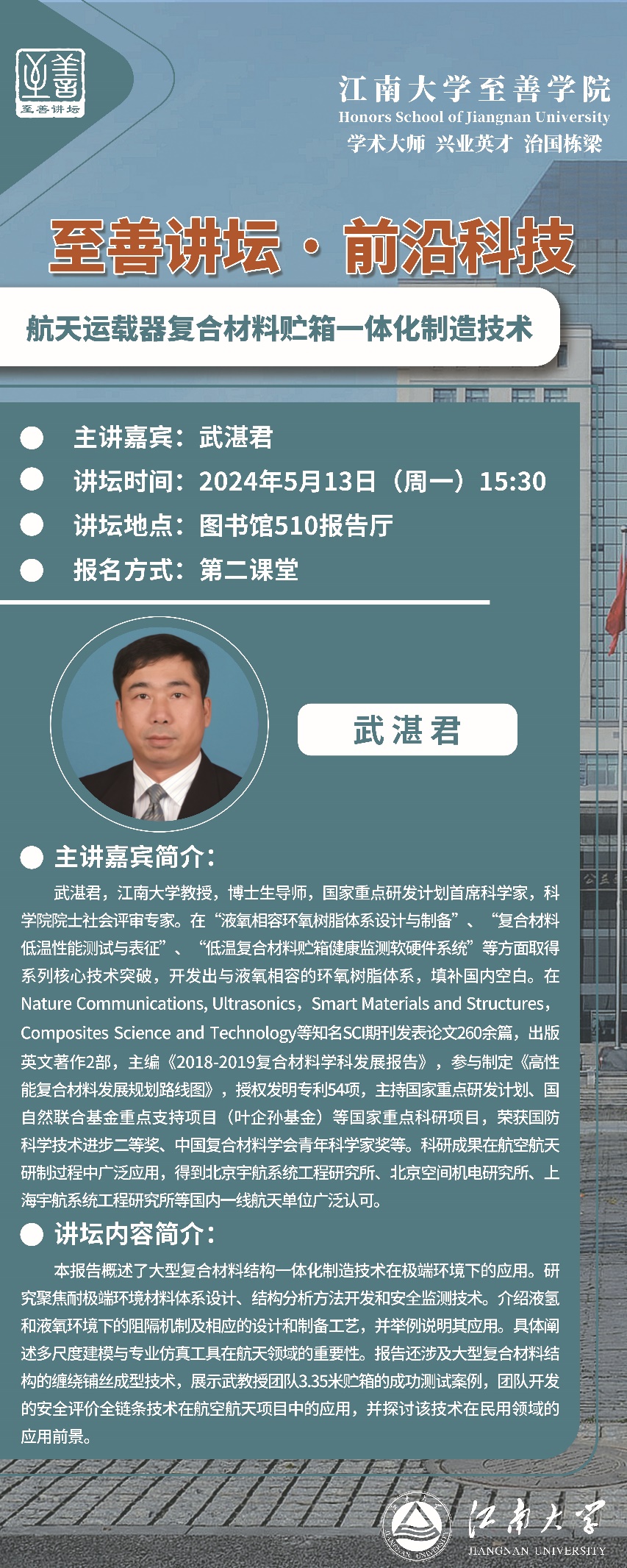 武湛君,江南大学教授,博士生导师,国家重点研发计划首席科学家,科学院院士社会评审专家。在“液氧相容环氧树脂体系设计与制备”、“复合材料低温性能测试与表征”、“低温复合材料贮箱健康监测软硬件系统”等方面取得系列核心技术突破,开发出与液氧相容的环氧树脂体系,填补国内空白。在Nature Communications, Ultrasonics, Smart Materials and Structures, Composites Science and Technology等知名SCI期刊发表论文260余篇,出版英文著作2部,主编《2018-2019复合材料学科发展报告》,参与制定《高性能复合材料发展规划路线图》,授权发明专利54项,主持国家重点研发计划、国自然联合基金重点支持项目(叶企孙基金)等国家重点科研项目,荣获国防科学技术进步二等奖、中国复合材料学会青年科学家奖等。科研成果在航空航天研制过程中广泛应用,得到北京宇航系统工程研究所、北京空间机电研究所、上海宇航系统工程研究所等国内一线航天单位广泛认可。