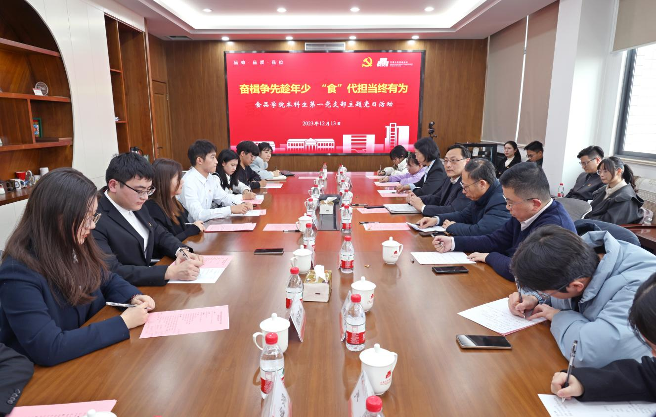 12月13日下午,食品学院本科生第一党支部举办“奋楫争先趁年少,‘食’代担当终有为”主题党日活动。校党委书记吴正国,党委组织部常务副部长方正泉,食品学院党委书记傅莉莉、党委副书记李雷、专职组织员、党建辅导员与本科生第一党支部全体成员参加活动。活动由党支部书记曹敏主持。