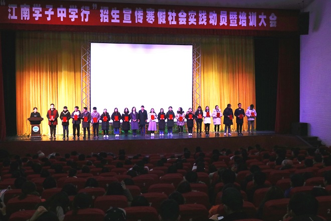 1月10日晚,2019年“江南学子中学行”招生宣传寒假社会实践动员暨培训大会在文浩馆召开。招生就业处副处长张婕英,招生科科长苏晓晋出席会议。2019年“江南学子中学行”招生宣传寒假社会实践经过前期宣传动员、学生组队报名和学校审核程序,最终从4100余位报名学生中遴选了2692名,组建561支团队,前往27个省(区、市)的642所省级重点中学进行招生宣传。1200余名团队负责人和学生代表参加了本次培训,招生就业处李金杰主持会议。