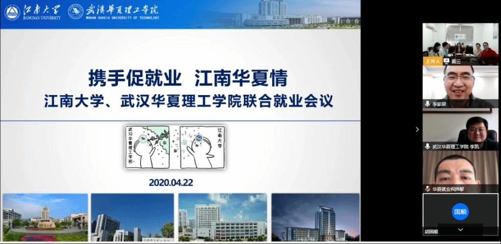 为落实习近平总书记重要指示批示精神和党中央、国务院关于做好“稳就业”工作的决策部署,助力湖北高校毕业生顺利毕业、尽早就业,根据教育部毕业生就业创业工作“一帮一”行动工作要求,4月22日下午,江南大学与武汉华夏理工学院通过视频会议的形式,对前期两校达成的帮扶合作协议做具体落实和推进。江南大学招生就业处副处长张婕英、武汉华夏理工学院就业服务中心主任李家梁、创新创业学院院长李凯、两校就业指导中心全体成员、创业服务工作指导老师、对口学院就业负责老师共20人参加会议。会议由江南大学就业指导中心主任戴云主持。