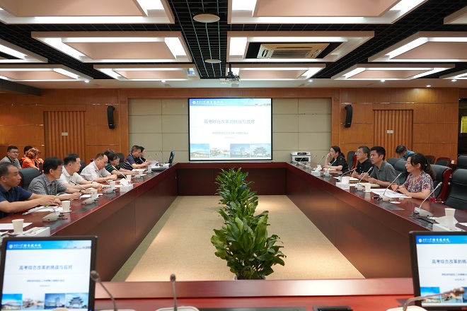 首先,招生就业处处长赵建新做了《高考综合改革的挑战与应对》报告,重点介绍高考综合改革、学校面临的生源挑战与机遇以及我们将如何应对三大板块内容。自2017年浙江、上海新高考改革落地,今年北京、天津、山东、海南两省两市也相继落地,加上明年江苏等八省(市),全国新高考改革落地省(市)数将达到14个。新高考改革在科目设置、录取批次、志愿填报和投档方式上均具有系统性革新。对于高校而言,新高考带来三大全新挑战:一是专业招生是主线,以专业为导向,考生的选择权变大,生源竞争由校际竞争转向专业竞争;二是录取批次取消,学校失去本一线保护,专业间生源质量差距增大,弱势专业录到本二、本三考生将成为常态;三是专业失去保护伞,按专业投档的,无专业调剂,按专业组投档的,无组间调剂,“优势热门专业扛旗,其他专业搭车”的情况不复存在。与此同时,随着新高考时代的到来,录取分数位次面临重新洗牌,高校招生回归起跑线,这也是所有专业进位争先的良好机遇。赵建新指出,要以改革为契机,一方面加强学科专业内涵建设,主动对接国家战略新兴产业谋篇布局,拓展专业发展空间;另一方面,围绕“科学选才”一个中心,依托教师、学生两支队伍,重点加强“学校教育部直属、无锡城市发展与魅力、专业人才培养与校园品质生活”三大特色宣传,吸引更多优质生源报考,从而占据新一轮“卡位战”的有利位置。随后他对今年高招季学校整体招生宣传工作做了重点部署。