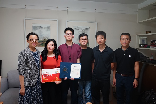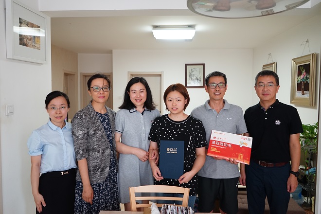 7月24日下午,江南大学副校长张影陆,招生就业处处长赵建新,人工智能与计算机学院院长刘渊,设计学院副院长曹鸣,商学院党委副书记、副院长徐静一行,为我校三位教职工子女亲送由陈卫校长亲笔签发的2021级本科新生录取通知书。