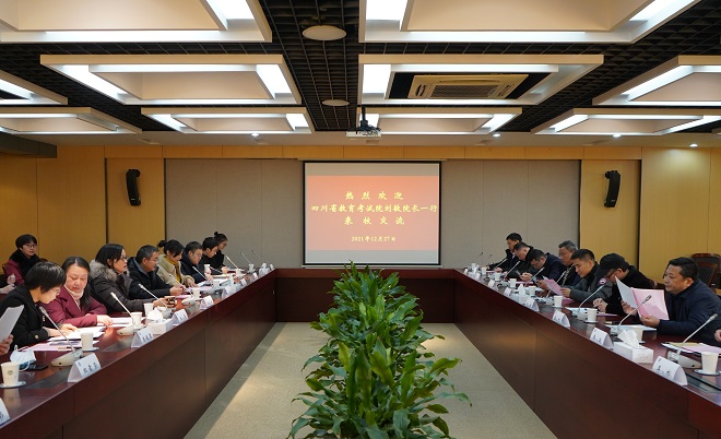12月27日下午,四川省教育考试院院长刘敏,副院长张刚,成都市教育考试院院长唐敏,宜宾市教育考试院副院长陈骏等一行来访江南大学就本科招生工作、新高考综合改革等进行调研交流。江南大学党委常委、副校长张影陆,招生就业处处长赵建新,纺织科学与工程学院党委书记、四川招生宣传组组长张菁,纺织科学与工程学院党委副书记、四川招生宣传组副组长陈艳君,人文学院院长助理屈廖健等出席座谈会,成都市石室中学、成都市第七中学、成都市树德中学、四川师范大学附属中学、成都外国语学校、成都实验外国语学校、绵阳中学、南山中学、绵阳东辰国际学校、南充高级中学、富顺第二中学、宜宾第一中学等12所在川重点中学校长共同来访参会。座谈会由招生就业处副处长张婕英主持。