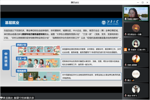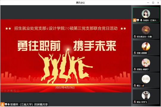 4月29日晚,招生就业处党支部与设计学院2003硕士党支部开展“勇往职前 携手未来”线上联合支部共建活动。本次活动在充分调研学生支部的需求下展开,针对2023届准毕业生们当前面临的一些困惑,招生就业处党支部发挥业务优势,精准指导学生支部党员的职业生涯发展。活动由共建党支部书记张婕英老师和刘雅倩同学共同主持。