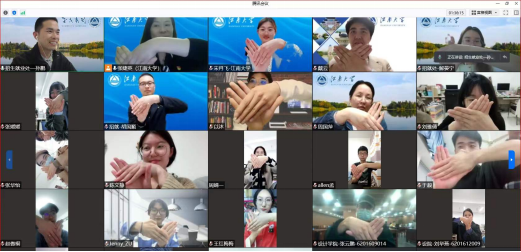 第三项议程,“五四”爱心手势送祝福,线上全体合影。“Give me five”“携手向未来”“以梦为马,向阳而歌”教师支部老师们提前预祝同学们节日快乐,祝福学生支部全体党员在即将到来的毕业求职季中率先垂范,争当就业先锋,在江南,成就最好的自己。线上支部共建活动持续近2个小时,活动在满屏的爱心祝福下落下帷幕。