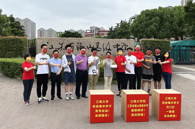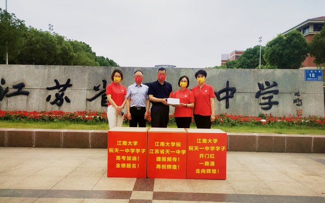 活动兵分四路,分赴江苏省天一中学、江苏省锡山高级中学、无锡市第一中学、江苏省辅仁高级中学、江苏省梅村高级中学、江苏省宜兴中学、江苏省南菁高级中学、江苏省江阴高级中学等赠送祝福口罩5万余个。江南大学老师们在各高中校门口向校领导、班主任、学生代表赠送口罩,并送上最诚挚的祝福,祝广大学子高考加油,金榜题名,祝各优质生源中学捷报频传,再创辉煌!