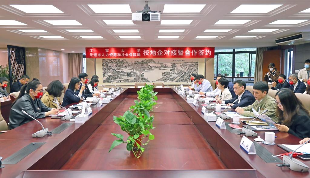 朱庆葆在行政楼A318贵宾接待室,接见了张映雪一行,对无锡市人社局对我校高层次人才引进工作给予的大力支持表示感谢。双方就市校共建、人才合作、师资队伍建设、毕业生就业等方面深入交换了意见。校地企合作交流座谈会上,张影陆致辞。她代表学校对无锡市人力资源和社会保障局以及无锡市各重点行业协会、重点企业长期以来给予学校的关心和支持表示感谢。她指出,深化校地企合作,促进产教融合,是建设创新型国家必须解决好的重要问题,“十四五”期间无锡市与江南大学开展全面、深度的战略合作,无锡市政府以更大力度支持江南大学加快推进“世界知名、中国一流、江南风格”的研究型大学建设,江南大学也将增设无锡产业发展所需学科、专业和学院,加快学科建设,加强科技创新,促进学科链、人才链与产业链、创新链有机衔接,为服务无锡产业民生提供保障,助力无锡城市高质量发展。她表示,学校将进一步加强与无锡人社系统的协同配合,持续开展无锡人才专场、校友企业专场、“名企职通车”等多种形式的市校共建系列校园招聘活动,积极鼓励毕业生到无锡市重点单位和行业就业,助力更多的学子汇聚到无锡的社会经济发展之中,在无锡成长成才、安居乐业。