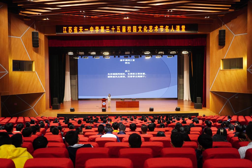 11月26日,江南大学“百名教授进名校”活动走进江苏省天一中学,适逢该校第35届校园艺术文化节开幕,人文学院黄晓丹副教授受邀走进“名人讲堂”,为300余名天一学子带来了《唐代文学的异想世界》文化讲座。