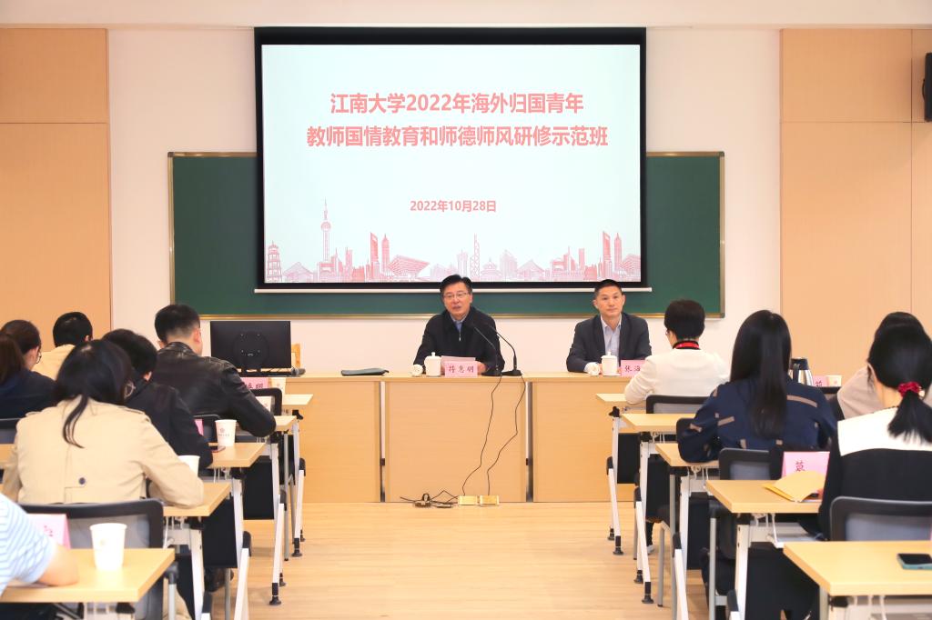 10月28-29日,“江南大学2022年海外留学归国青年教师国情教育和师德师风研修示范班”在无锡市委党校开班。来自各学院的海外留学归国青年教师代表和专职组织员40余人汇聚一堂,参加为期2天的专题研修活动。校党委副书记符惠明到会作开班动员并作师德师风专题报告,党委教师工作部部长张海峰主持开班仪式。