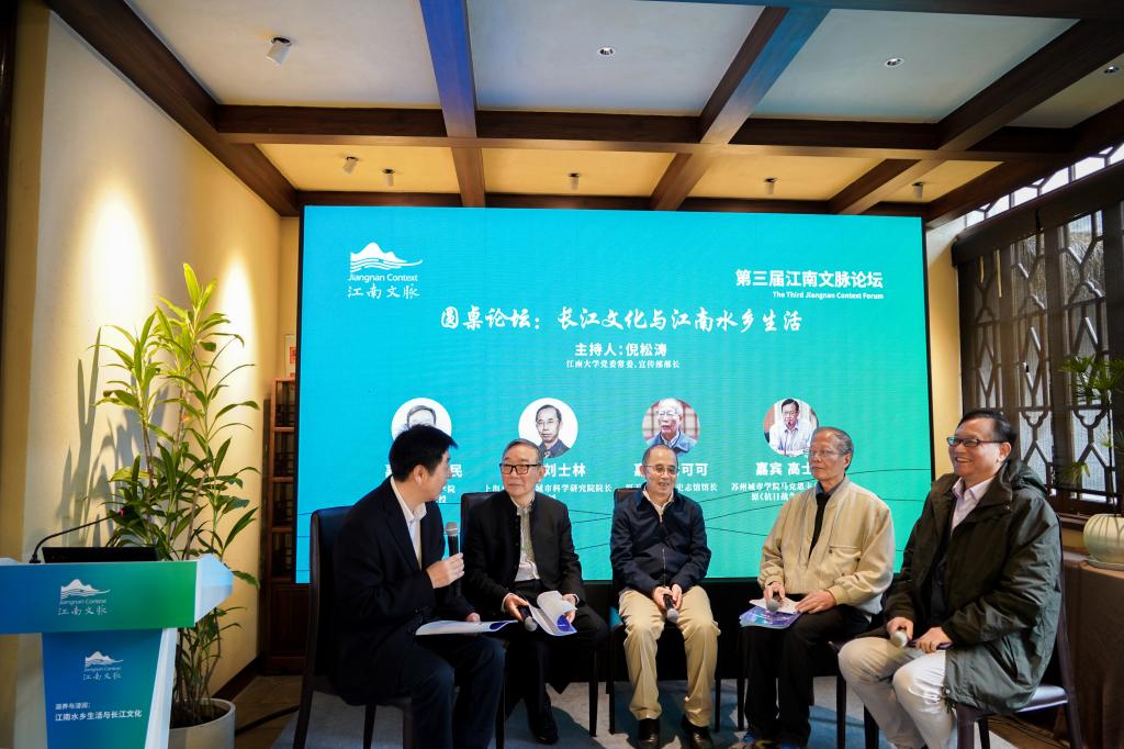 圆桌论坛围绕长江文化与江南水乡生活展开,由倪松涛主持。浙江大学历史学院求是特聘教授陈红民、上海交通大学城市研究院院长刘士林教授、原无锡市档案史志馆馆长汤可可、苏州城市学院马克思主义学院院长、原《抗日战争研究》主编高士华,就长江文化、江南文化的诸方面展开深入的对话与交流。
