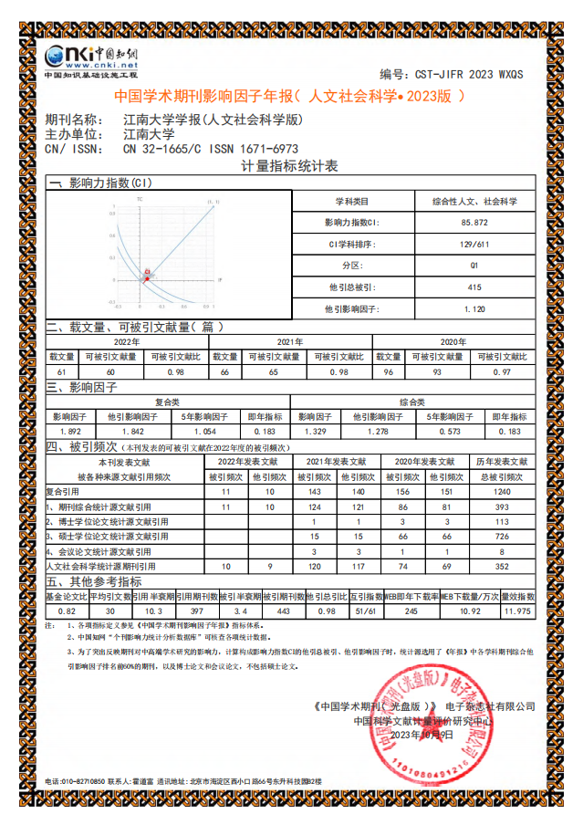 近日,《中国学术期刊(光盘版)》电子杂志社有限公司与中国科学文献计量评价研究中心联合发布《中国学术期刊影响因子年报》(2023版),《江南大学学报(人文社会科学版)》(以下简称“学报社科版”)影响力各项指标继续提升。2023年度学报社科版影响力指数CI值为85.872,在全国611种综合性人文、社会科学学术期刊中排名第129,位于Q1区;复合影响因子为1.892,综合影响因子为1.329,均实现大幅度提升与历史性突破。