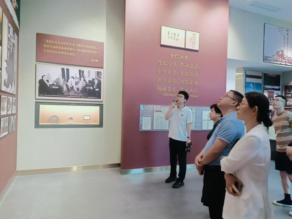 展览分为序厅和东西两侧展厅,序厅中央陈设着汉白玉荣毅仁塑像,东西展厅则分别介绍了荣毅仁实业报国的从商历程和勤勉为政的国家领导人经历。党员们被荣毅仁先生从民族资本家到上海市副市长,再到中信集团奠基人,最终成为国家副主席的丰富传奇一生所深深打动。在“荣毅仁生平年表”展台前,叶军领誓,全体党员重温入党誓词,铭记初心使命,坚定理想信念。