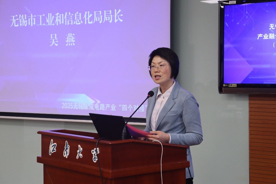 马鑫在致辞中强调,江南大学始终将服务地方发展作为重要使命,通过构建“人才链-产业链-创新链”三链融合体系,创新实施校企“双导师制”“定制化培养”等育人模式,学校特别成立市校共建办公室,统筹推进与无锡市在学科建设、科研攻关、成果转化等领域的深度合作,本次对接活动正是落实“名城名校”战略的生动实践。无锡市工业和信息化局局长吴燕在致辞中强调,为了务实推动无锡与江大市校产业融合创新,今天从集成电路领域开始挖掘江大“这座家门口的富矿”,组织30多家集成电路企业与江大团队精准对接,推动江大集成电路设计、MEMS传感器、光电集成、宽禁带半导体、新型存储、新型半导体材料和设备等先进技术成果转化、产业化,实现从“研究到研发、老师到老板、就业到创业、场景到风景”转变。顾晓峰系统展示了学院的创新发展路径。学院始终秉持“立足无锡、服务长三角、辐射全国”为办学宗旨,持续深化校地企协同创新,积极助推无锡“465”现代产业集群建设。学院建立了覆盖集成电路设计、制造、封测全产业链的产学研合作网络,形成了“技术共研、人才共育、成果共享”的良性生态。