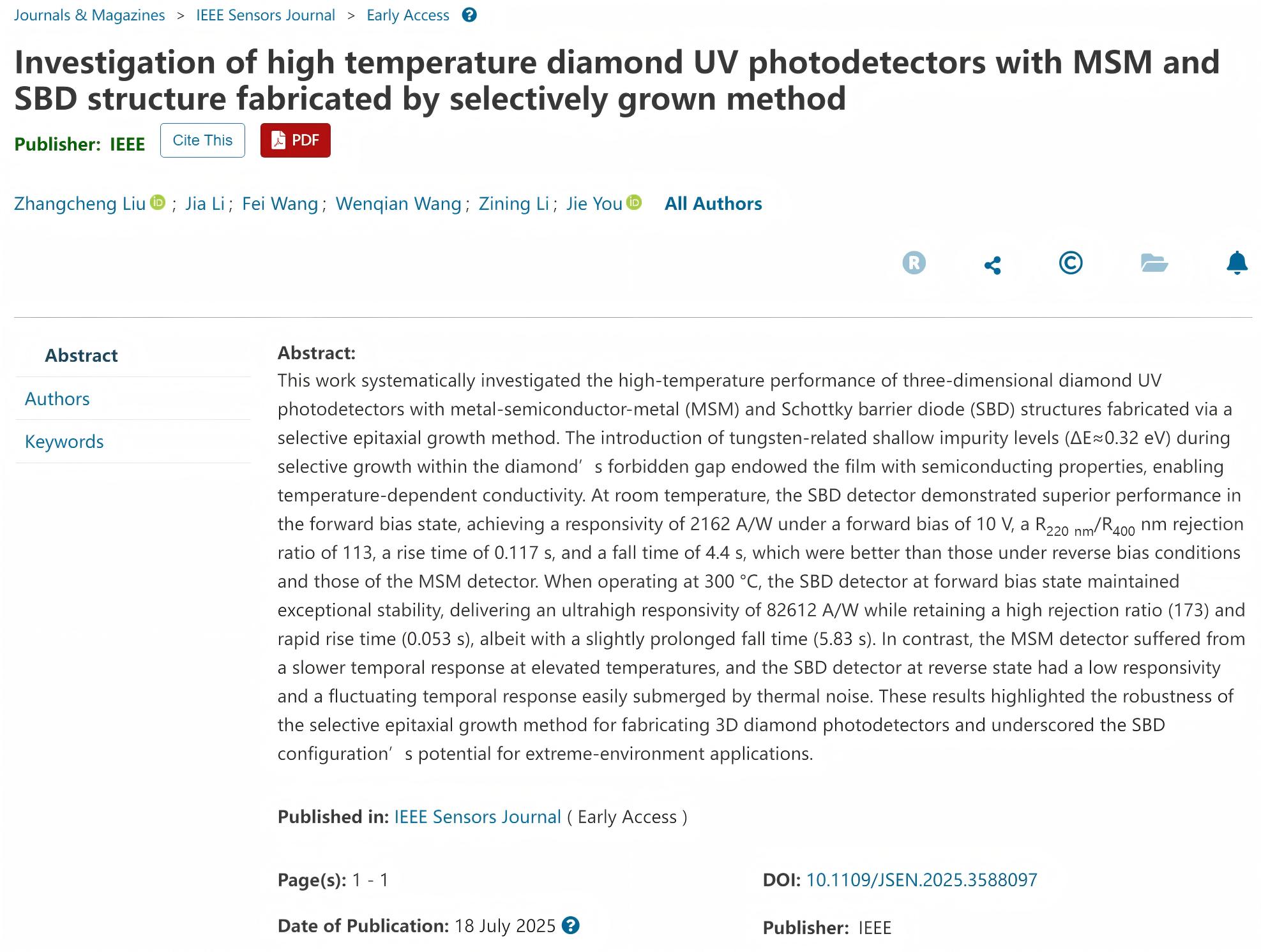 李佳同学的论文题目为“Investigation of High-Temperature Diamond UV Photodetectors With MSM and SBD Structure Fabricatedby Selectively Grown Method”(DOI: 10.1109/JSEN.2025.3588097)。传统硅基紫外探测器受窄带隙的限制,高温下光信号检测能力较弱,相比之下,金刚石则凭借超宽带隙、优异的导热性以及出色的抗辐射能力,成为高温紫外探测的理想选择。该论文对选择性外延制备的3D MSM和SBD结构金刚石紫外探测器进行了系统的高温性能表征,发现正向偏置的SBD探测器在高温环境下展现出最优性能组合:高响应度、高紫外/可见抑制比及快响应速度,表明肖特基势垒设计既能有效抑制缺陷相关响应,又可维持高效载流子输运。此外,选择性外延生长法确保了电极-金刚石界面的高温稳定性,MSM结构的欧姆接触与SBD结构的整流特性在高温下均得以保持。这些结果充分证明了选择性外延3D金刚石探测器在极端环境应用的可行性。该研究得到了国家重点研发计划(2024YFE0205100)、江苏省重点研发计划(BE2023007-1、BG2024019)、中央高校基本科研业务费专项资金(JUSRP202501020、JUSRP202501032)、重庆市科技创新重点研发计划(CSTB2024TIAD-STX0007)的资助。