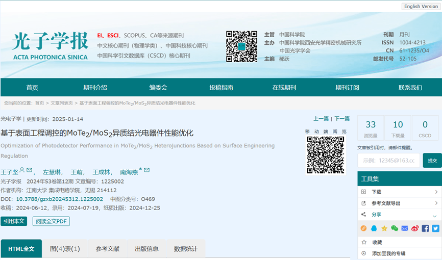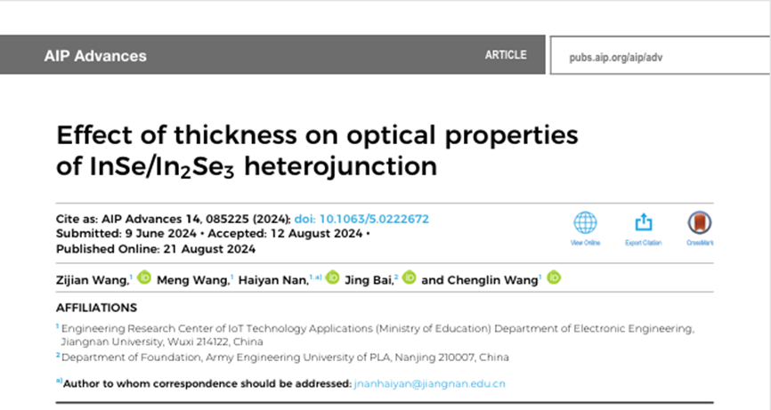 汗水浇灌收获,凭借在南老师课题组中的出色工作,王子坚同学不仅取得了本科生优秀毕业设计的荣誉,更产出了丰硕的科研成果:一篇中文EI期刊论文《基于表面工程调控的 MoTe2/MoS2异质结光电器件性能优化》,以及一篇SCI期刊论文《Effect of thickness on optical properties of InSe/In2Se3 heterojunction》。
