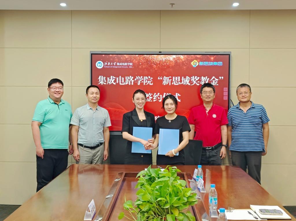 为了进一步探索院企协同育人模式,助力新工科创新人才培养,9月8日下午,江南大学集成电路学院与江苏新思域教育科技集团有限公司开展交流合作签约活动。新思域集团总经理王斌、副总经理杜皎阳,集成电路学院全体班子成员、系主任参加交流签约仪式。