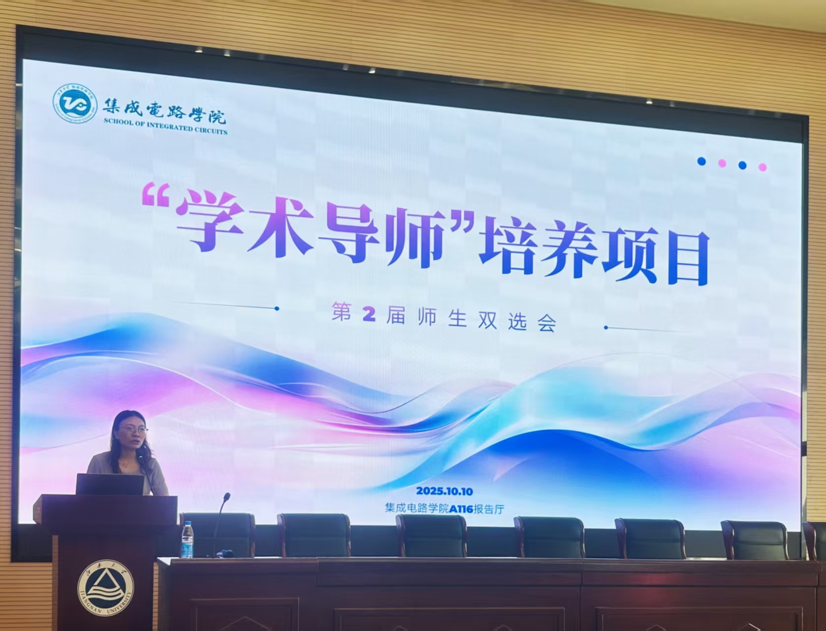 为进一步打造“三全育人”工作格局,大力提升本科生学术素养,近日,集成电路学院在A116报告厅举办第二届本科生导师制“学术导师”培养项目师生双选会。刘璋成、翁正进等“学术导师”现场介绍科研情况,百余名本科生深度参与。会议由学院党委副书记、副院长糜海燕主持。