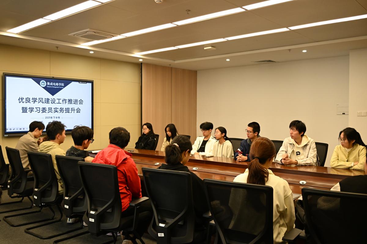 为强化打造学院优良学风,优化提升学习委员与学习促进部履职能力,10月24日,集成电路学院2025下半年优良学风建设工作推进会暨学习委员实务提升会于学院A306会议室召开。学院党委副书记、副院长糜海燕,学风条块辅导员谢幸福出席会议,学生会学习促进部全体人员和各年级学习委员参加本次活动。