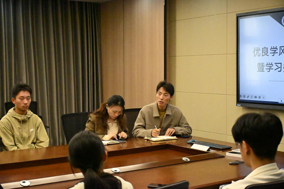 会上,糜海燕强调优良学风建设工作的深远影响和推进思路。她指出,学习委员需要不断提升对考勤监督,学业督促等日常工作的重要性和警惕性认识,并通过相关数据对比,让学生干部直观体会到优良班风学风对人才培养质量起到的关键作用。她要求与会人员要发挥骨干协同作用,创新学习帮扶模式,抓实细节管理,强化学风传承与反馈,坚持“早发现,早解决”原则,在责任意识和担当作为不掉线的基础上,不断落实各项优良学风举措。随后,谢幸福围绕学风骨干的角色定位和工作策略等展开培训。他讲到,学风骨干要强化“服务者”意识,以良好的沟通和真诚的帮助打通同学的“成长之困”。同时,他解读了“重要工作内容”“关键表率示范”“核心工作举措”“学会协同作用”等方面的内涵,为学习委员与学习促进部高效开展优良学风建设工作、持续生发育人力量提供了行之有效的办法。