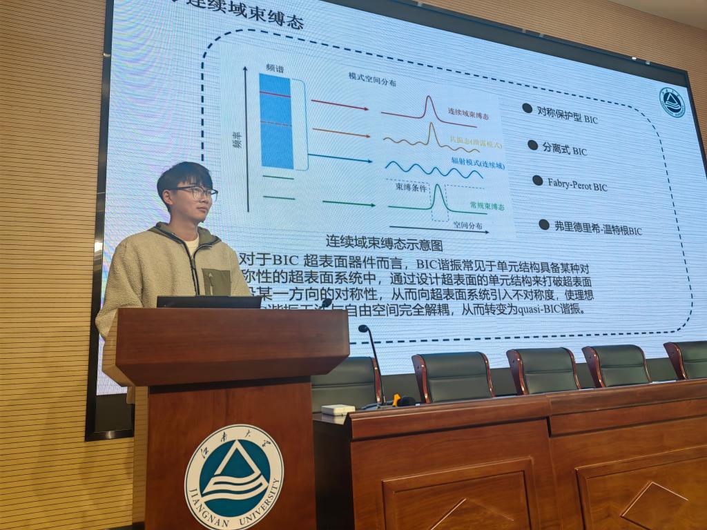 王亮以《基于太赫兹超材料的谐振结构传感器研究》为主题,他介绍了研究背景,包括太赫兹波特性、超材料优势、晶格共振、连续域束缚态及国内外研究现状以及阐述研究进展,内容涉及基于晶格共振、QBIC和谐振结构太赫兹传感器的结构、吸收峰、近场分布及传感性能等,最后他总结了超表面应用前景,指出本研究设计相关传感器并分析其机制与高传感性能。