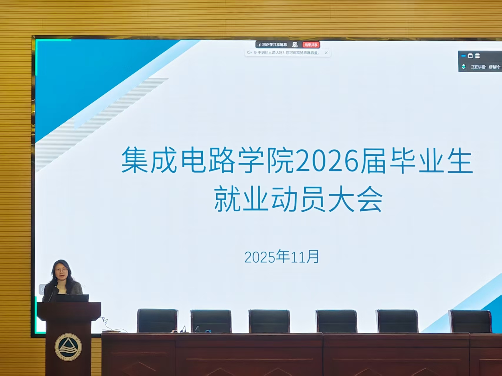 11月5日,集成电路学院在A116报告厅召开2026届毕业生就业工作会议,学院党委副书记兼副院长糜海燕作动员讲话,研究生辅导员王涛、本科生辅导员缪慧玲及全体毕业年级学生参会。会议聚焦就业形势、升学数据与实践指导,为毕业生提供全方位规划支持。