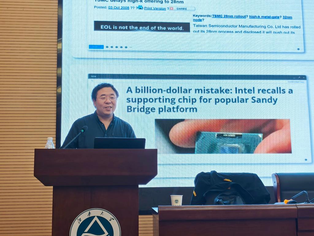 11月11日上午,由江南大学研究生院主办,集成电路学院承办的江南讲坛第一百四十五讲暨第十八期IC科技论坛在集成电路学院A116报告厅顺利召开。本次论坛特邀上海交通大学集成电路学院纪志罡教授担任主讲嘉宾。讲坛围绕“面向未来的集成电路可靠性:技术现状与未来方向”这一核心议题,展开了深入的学术探讨与交流。本次报告不仅吸引了学院逾百名师生参与,还汇聚了长三角集成电路创新中心、无锡科技职业学院和部分集成电路企业的专家学者,共话行业前沿技术。