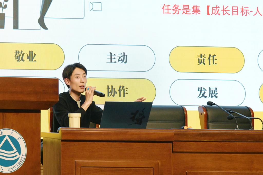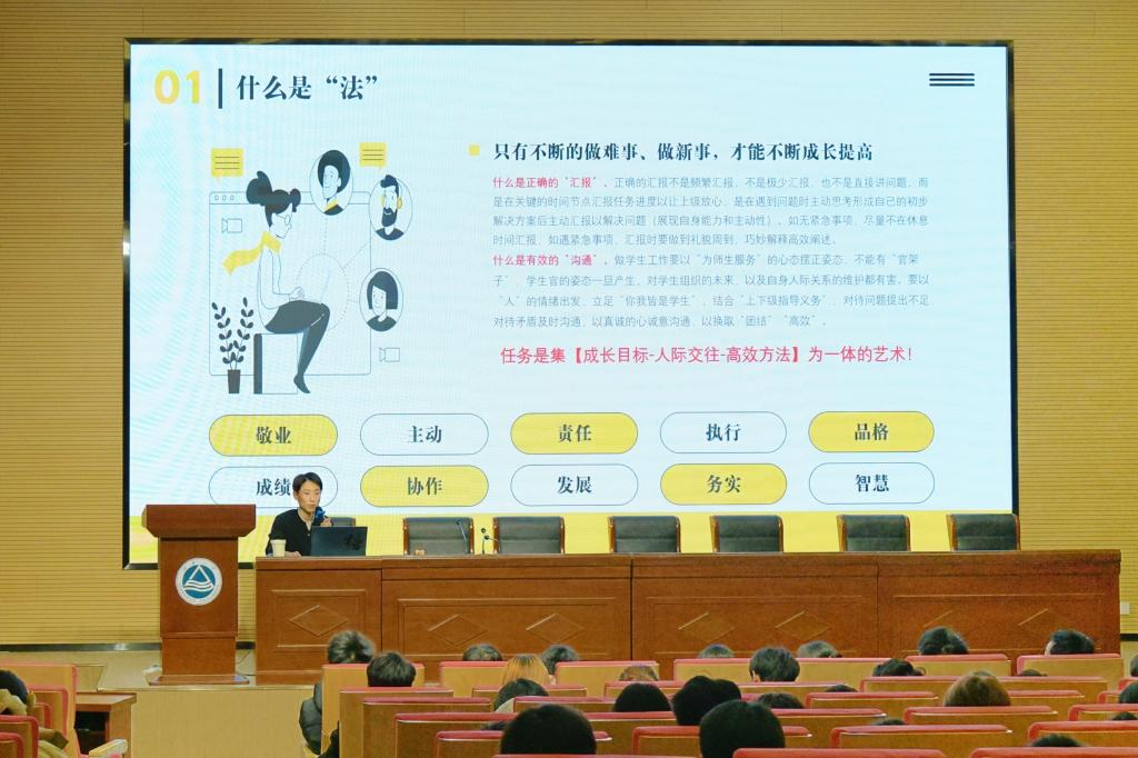 培训中,谢幸福围绕“在风雨中做事,在奉献中成长”这一主题,系统阐述了学生工作中的责任担当与奉献精神。他结合与学生组织密切相关的各类活动,围绕“工作方法”“工作质量”“工作效率”“工作进度”“组织传承”展开细致深入的讲解,极大提升了与会人员对学生工作的理解与工作能力。他提到,传承不仅在于荣誉、方法和制度,更在于对良好的价值观念、个人信念与团队精神的延续。学生组织成员应在日常工作中善于发现与解决问题,在协作与决策中积累经验,塑造传承,推动组织持续良好发展。