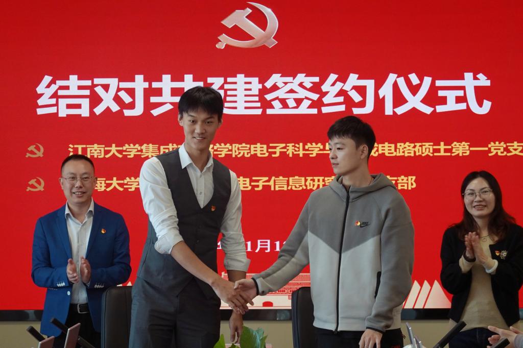 上午,江南大学集成电路学院电子科学与集成电路硕士第一党支部书记胡浩宇与上海大学微电子学院电子信息研究生党支部书记俞浩在江阴霞客湾校区行政楼304会议室共同签署结对共建协议,糜海燕、袁铭见证签约。此次结对共建是实现资源共享、互学互鉴、共同提高的重要举措,标志着两院在携手并进、共创未来的道路上迈出了坚实的一步。