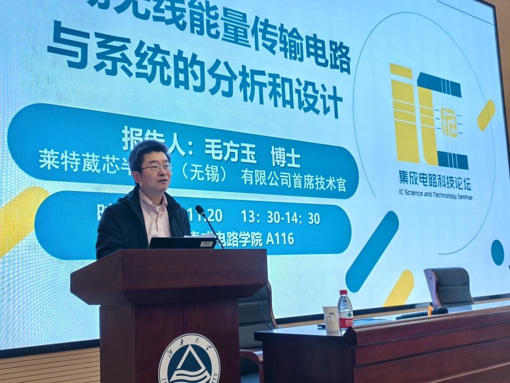 毛方玉博士以《近场无线能量传输电路与系统的分析和设计》为主题展开,围绕着在电路设计、仿真验证、流片测试等方面的研究经历,分享团队在“设备到设备无线充电”方面的创新设计及取得的成果,包括“可重构交叉连接无线电源TRX”“差分混合ed类功率放大器”“自动最大效率点追踪设计”等内容。毛博士还介绍了莱特葳芯半导体(无锡)有限公司在创立、运营、研发等方面的情况,为在场师生呈现了科技创新推动产业发展的生动案例。现场师生受益良多,纷纷与毛博士展开热烈探讨交流。