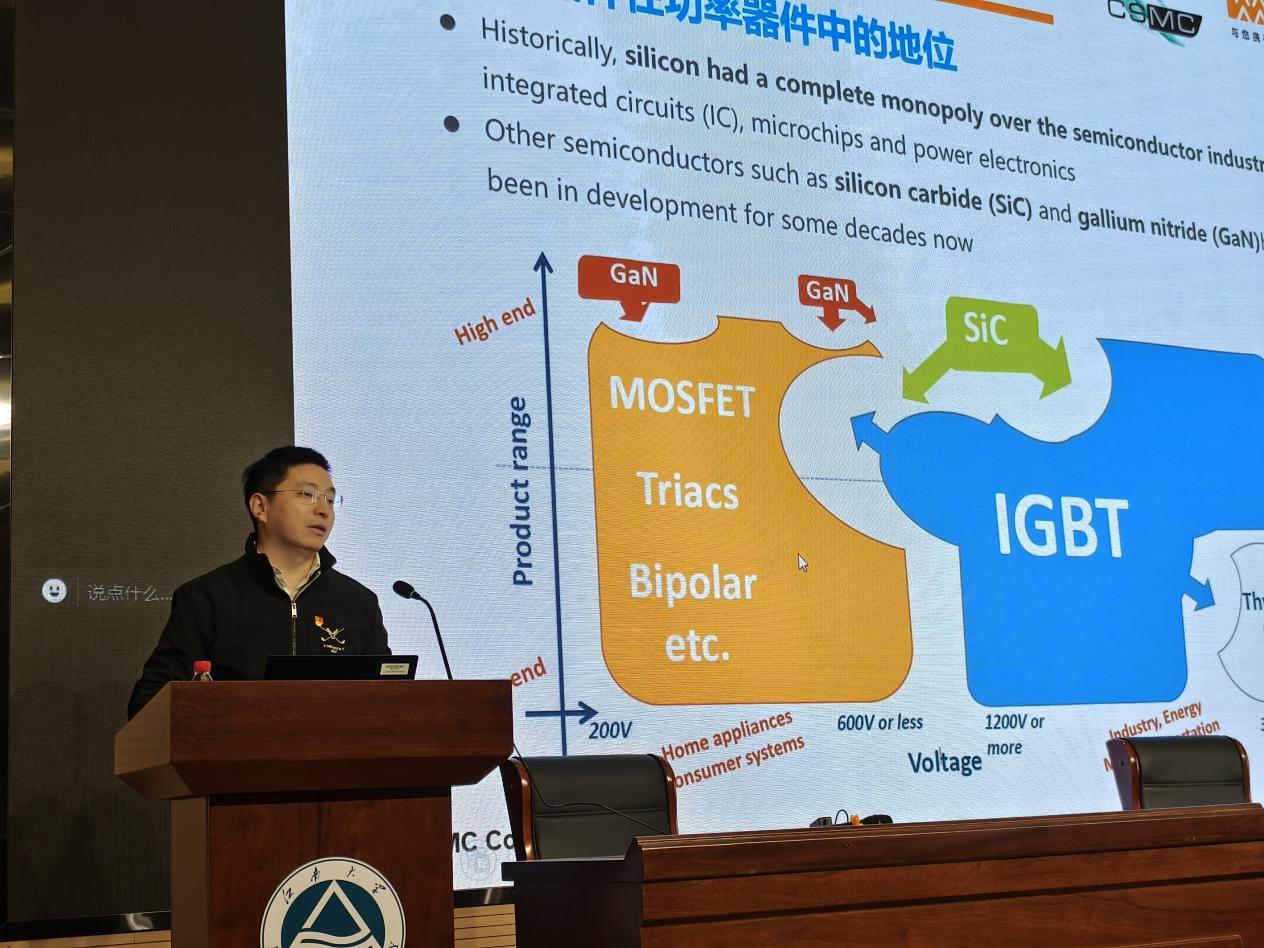 肖魁以《IGBT Device and Application》为主题,围绕 IGBT 器件概述、应用、结构工艺技术、基本特性、坚固性、结构创新及未来发展趋势等方面展开。他首先介绍了IGBT 在功率器件中的地位、基本结构及特性需求、制作工艺和技术演进,详细列举了其在汽车、UPS、轨道交通、光伏、电机驱动、工业电焊机等领域的应用方向。其后,他从结构工艺技术方面介绍了NPT 技术等5种IGBT器件的主流结构技术,并具体阐述了IGBT发射结载流子浓度增强技术、IGBT集电极低空穴注入技术。接着,他讲解了IGBT 器件的特点、参数、导通与开关特点、优化目标、阻断特性、掺杂及电场分布、导通特性、数学模型、开关特性等内容,探讨了闩锁效应、雪崩耐量、短路能力、安全工作区、温度系数等相关内容,展示了载流子存储增强、高开关可靠性提升、短路能力及器件性能提升、开关电容及导通压降性能提升等创新技术,最后,他对IGBT 技术演进、市场发展趋势、特点及应用需求催生的产品公司情况进行了分析和展望,为在场师生构建了有关IGBT器件全方位的知识体系。现场师生受益良多,并与肖总监展开热烈探讨交流。