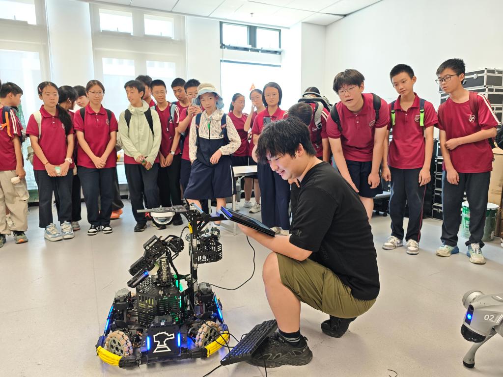 同学们了解了智能制造学院(君远学院)的历史沿革与发展现状,参观了智能制造、智能机器人、智能材料与精密加工等科研实验室,探访了机器人赛队,近距离感受科技创新。机器人赛队郭兰鑫等队员为同学们演示了RoboMaster比赛机器人、机器狗,并指导同学们亲手操作英雄机器人、哨兵机器人等发射子弹完成攻击任务。