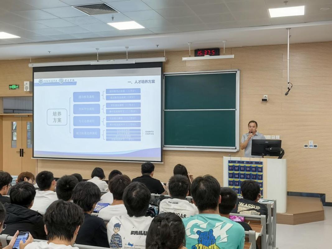 田登科首先为新生们详细解读了专业培养方案。他系统介绍了大学四年的课程体系架构,明确了各专业学生所需修读的总学时和学分要求,为同学们规划学业提供了清晰的路线图。接着,他重点讲解了学籍管理的重要规定和课程考核的相关规则,通过具体案例说明了学业警示、毕业条件等关键事项,提醒同学们务必遵守教学秩序,重视每一门课程的学习。