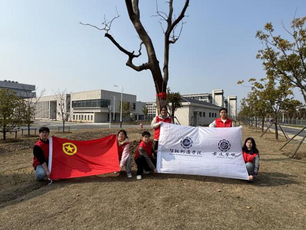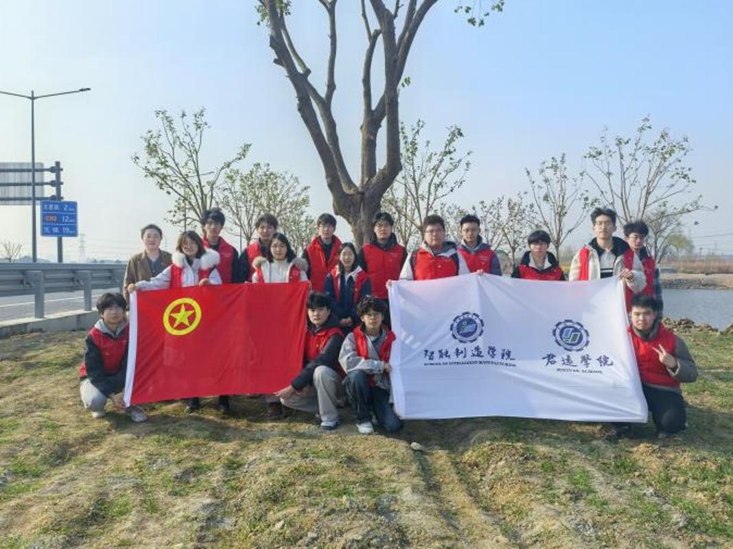 在江阴市青阳镇2026年全民义务植树活动中,智能制造学院君远新工科卓越创新班16名学子将主题团日活动开到植树现场,挥锹培土,为当地生态建设增添新绿。活动现场,学子们以三至五人为组,紧跟绿化工作人员的专业指导,配合完成培土围堰、提水浇灌等一系列操作。从聆听植树护绿倡议书,到亲手栽下希望之树,学子们在劳动中体会到植树造林的意义,更在服务地方的实践中,将实干精神融入生态建设的行动中。