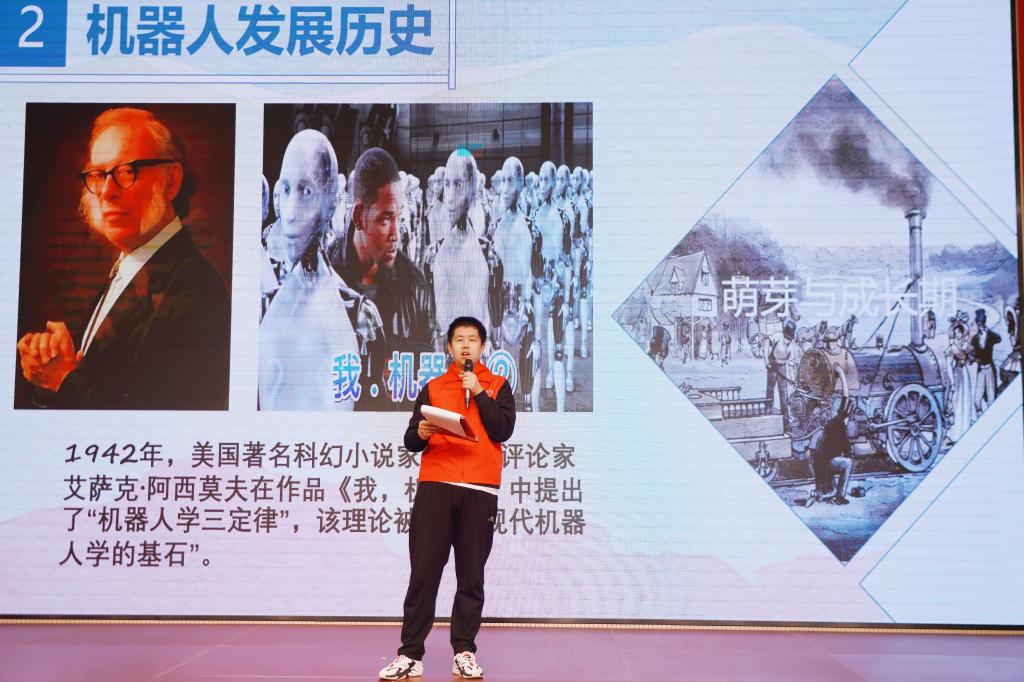随后,主讲人王润泽以生动有趣的方式,为小朋友们科普了机器人的发展史与著名的机器人三大定律。从人类对机器人的最初幻想,到如今机器人行业的蓬勃发展,他详细阐述了机器人领域的艰辛历程与辉煌成就。在问答环节,同学们积极举手发言,展现出了对科学问题的浓厚兴趣与好奇心。志愿团成员们也为同学们准备了精美的小礼品,以鼓励他们勇敢探索未知领域。