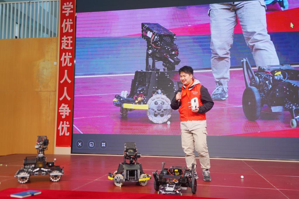 随着活动推进,机器人项目展示环节将气氛推向高潮。周传辉同学带来了凸轮转向原理的展示,凸轮小车展示出小小凸轮蕴含的神奇机械原理;虞思阳与陈晨同学则带来了电磁小车实验,电磁小车则生动诠释了电与磁紧密相连的奇妙关系。而江南大学智能制造学院Shark机器人俱乐部郭兰鑫带来的机器人展示,更是让同学们近距离感受到机器人对战比赛的无限魅力,激发了他们心中制造机器人的梦想种子。