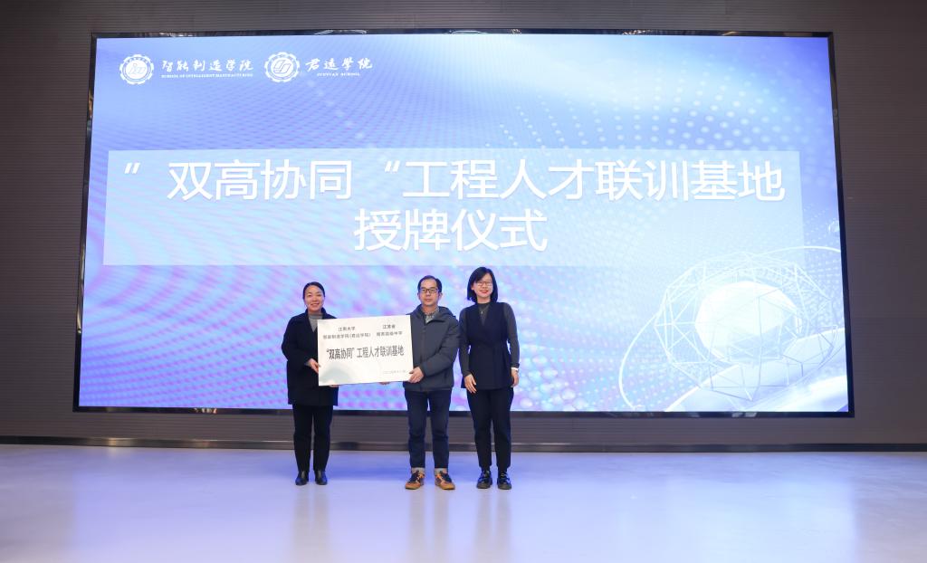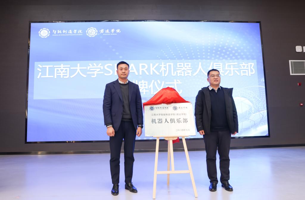 王小燕、刘虹代表学校向江苏省南菁高级中学授予“双高协同”工程人才联训基地铜牌;吴垚、宁萌为江南大学SHARK机器人俱乐部揭牌;蒋毅、宁萌为俱乐部成员颁发聘书。俱乐部成员郭兰鑫、润斐、万宇阳向现场嘉宾及师生们展示俱乐部自主设计、制作的步兵机器人和英雄机器人,并熟练操控着机器人对定向靶完成了精准射击。