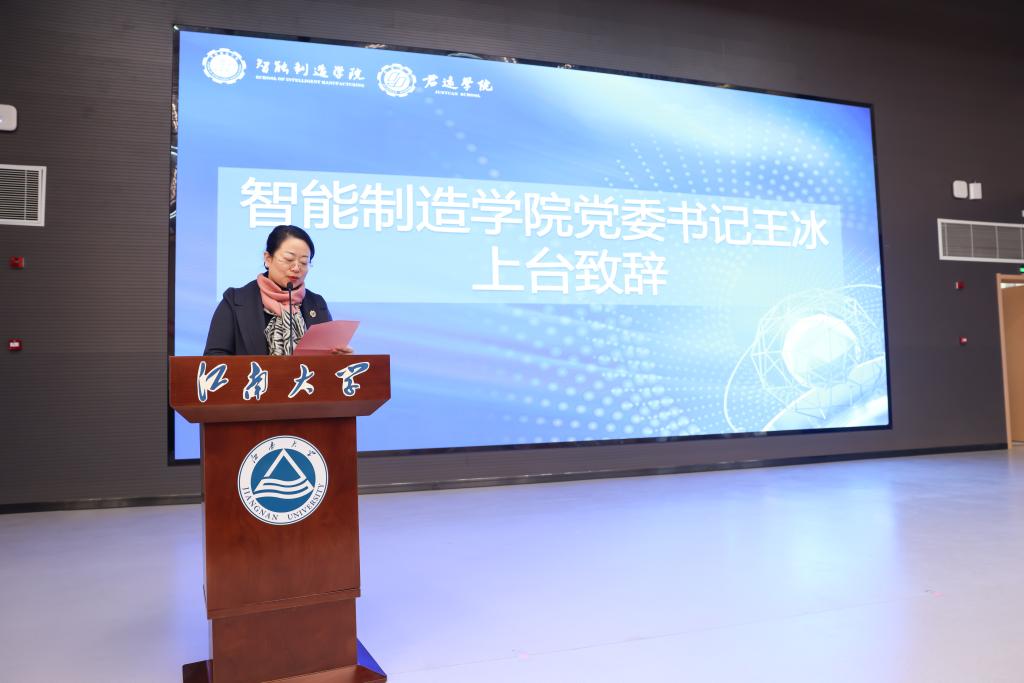 在开幕式上,王冰代表学院致辞,向学校有关职能部门和江阴五大高中的鼎力支持表示感谢,介绍了学院到江阴校区办学的基本情况、教学特色以及在大学生科创竞赛方面的建设思路,回顾了学院前期深度参与地方工程人才培养体系的合作成果。她表示学院将坚持卓越工程师人才培养目标,深化赛课融合模式,持续致力于高校、高中“双高互动”,创新工程教育一体化建设,进一步扩大区域工程人才培养的联动覆盖面,力求在地方智能制造产业发展和工程人才培养工作中贡献江南力量。