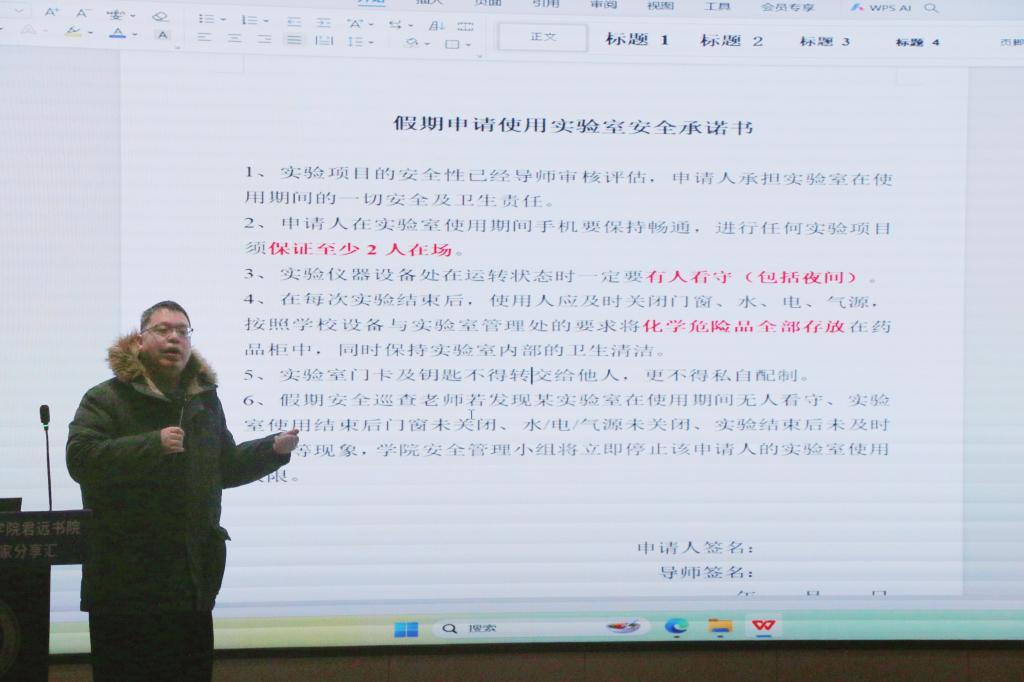 筑牢防线,把好假前“安全关”。1月9日下午,学院于翔千厅召开了寒假留校学生安全教育大会。会上,分团委、学工办负责人高鑫和辅导员熊欣仪分别围绕宿舍安全、消防安全、人身财产安全、出行安全和网络安全等方面展开讲解注意事项。院长助理宋飞虎开展了寒假期间实验室使用安全教育,强调了实验项目的安全性须经导师审核评估,进行任何实验项目须保证至少2人在场,实验结束后须及时关闭门窗、水、电、气源等各项实验室安全使用规定。最后,学院党委副书记兼副院长徐静作总结发言。她代表学院表达了对留校学生的关心,希望留校同学们合理规划作息,注意留校期间安全,遵守相关规定,携手度过一个安全祥和的假期。
