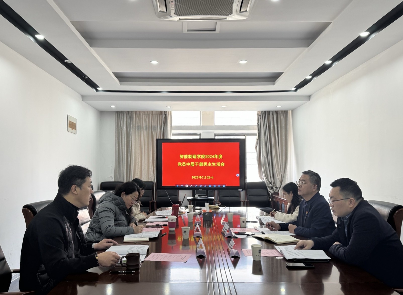 2月26日下午,智能制造学院2024年度党员中层干部民主生活会在学院E404会议室召开。校党委委员、人力资源处处长、人才办公室主任兼党委组织部副部长赵建新,校纪委委员、设计学院党委书记王维青到会指导。会议由学院党委书记王冰主持,学院全体领导班子成员参会。