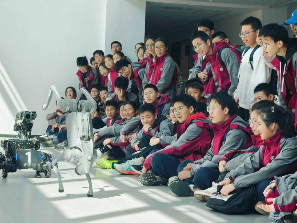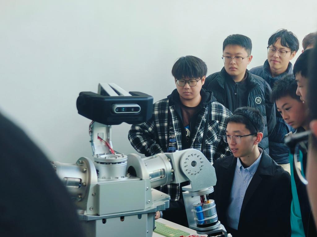 在本次研学实践活动中,南菁中学书院部师生们还前往智能制造学院参观学院实验室和机器人展示区。由学院研发的“艾德”人形机器人以语言交互系统与学生展开对话互动;SHARK机器人俱乐部现场演示了步兵机器人超高速自转、平移、射击等性能,操控四足机器狗完成了握手、作揖等拟人化动作。这些具备AI交互能力的智能设备引发了学生们的强烈兴趣,纷纷上前互动体验。此外,师生们相继参观了数字科技与创意设计学院的数字创新实验室、图书馆数字化阅览空间,通过体验智能座舱人机交互、智能化数字设备等,进一步立体化感受现代科技的魅力。