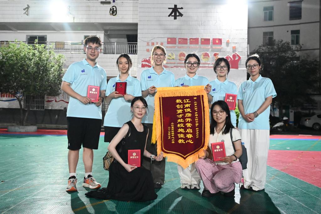 此前,从江县文旅局组织召开“手指上的中国”社会实践活动座谈会暨启动仪式,从江县副县长谢卫忠出席,相关乡镇负责人、非遗文化传承人、实践团师生一行等到会。实践团为岜沙村、小黄村、高华村、云上月亮非遗工坊、丙妹镇中心小学颁发“江南大学数字科技与创意设计学院社会实践合作单位”,为非遗传承人滚叶道、吴荣德颁发“江南大学数字科技与创意设计学院校外实践导师”聘书。离别的前一天,丙妹镇中心小学连夜为同学们送来了锦旗和荣誉证书。“乡村振兴离不开教育振兴,而美育是乡村教育中不可或缺的一环。”江南大学数字科技与创意设计学院“手指上的中国”社会实践团带队老师章琳表示,“我们希望通过校地合作,建立起美育帮扶的长效机制,让艺术的种子在乡村孩子心中生根发芽。对于参与实践的学生而言,这次经历不仅是专业能力的锻炼,更是一次深刻的思想教育。学生们将课堂所学应用于实际,在解决现实问题的过程中提升综合素质,为乡村振兴贡献青春力量。”